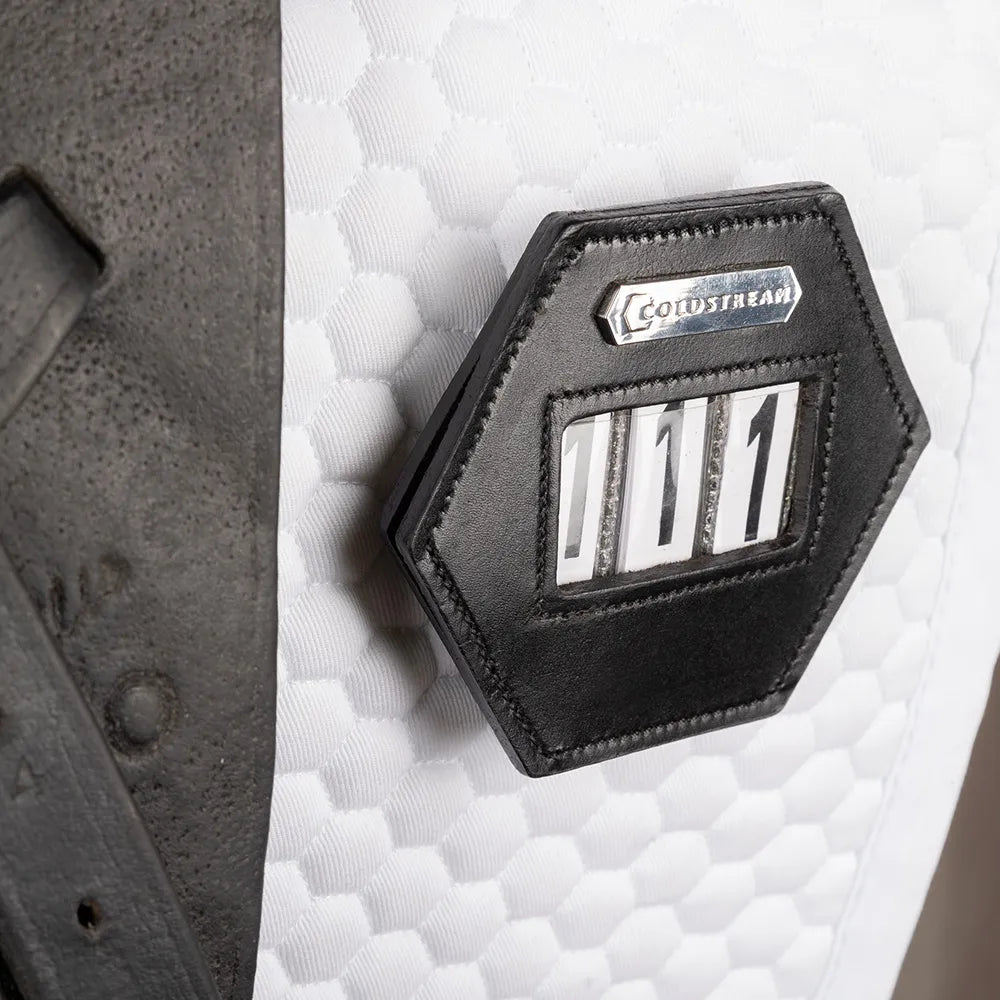 A sleek, lightweight leather number holder able to display up to three digits of your choice. Innovatively shaped in the unmistakable Coldstream hexagon with an engraved branded pin in silver. Expertly designed to offer the choice of attaching to either the bridle or the saddle pad safely and securely. Complete with numbers to insert.