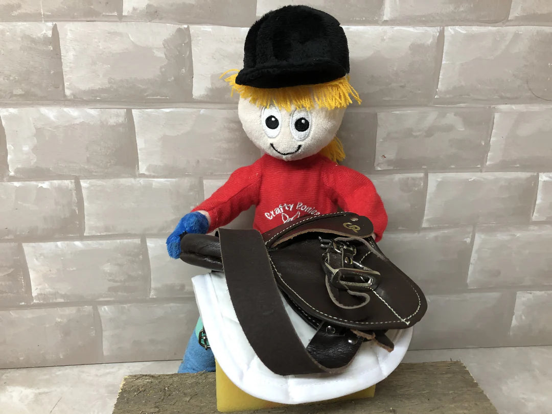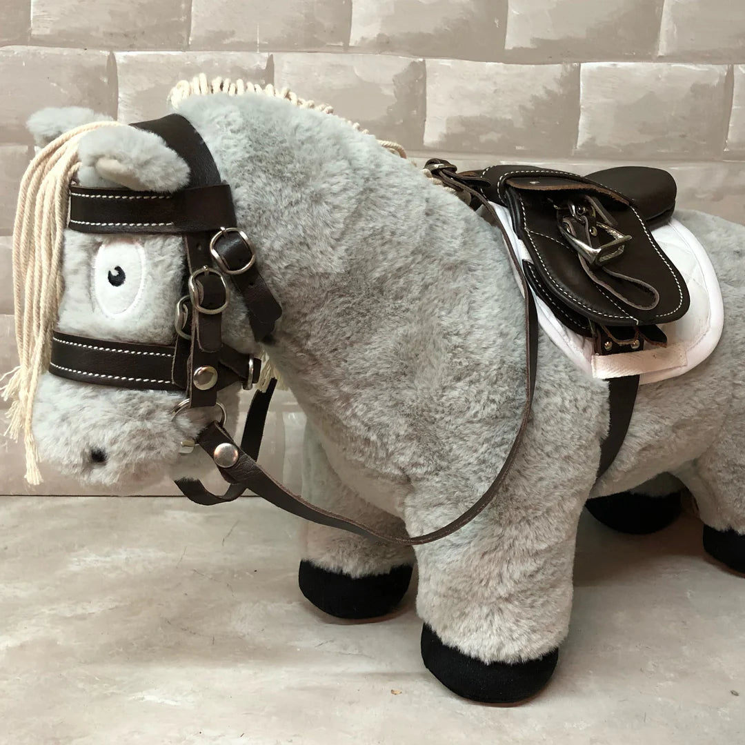 Crafty Ponies leather saddle is beautifully handmade, it is an English style saddle in miniature, with a tree, padded panels, padded knee rolls, a leather girth and stirrups.